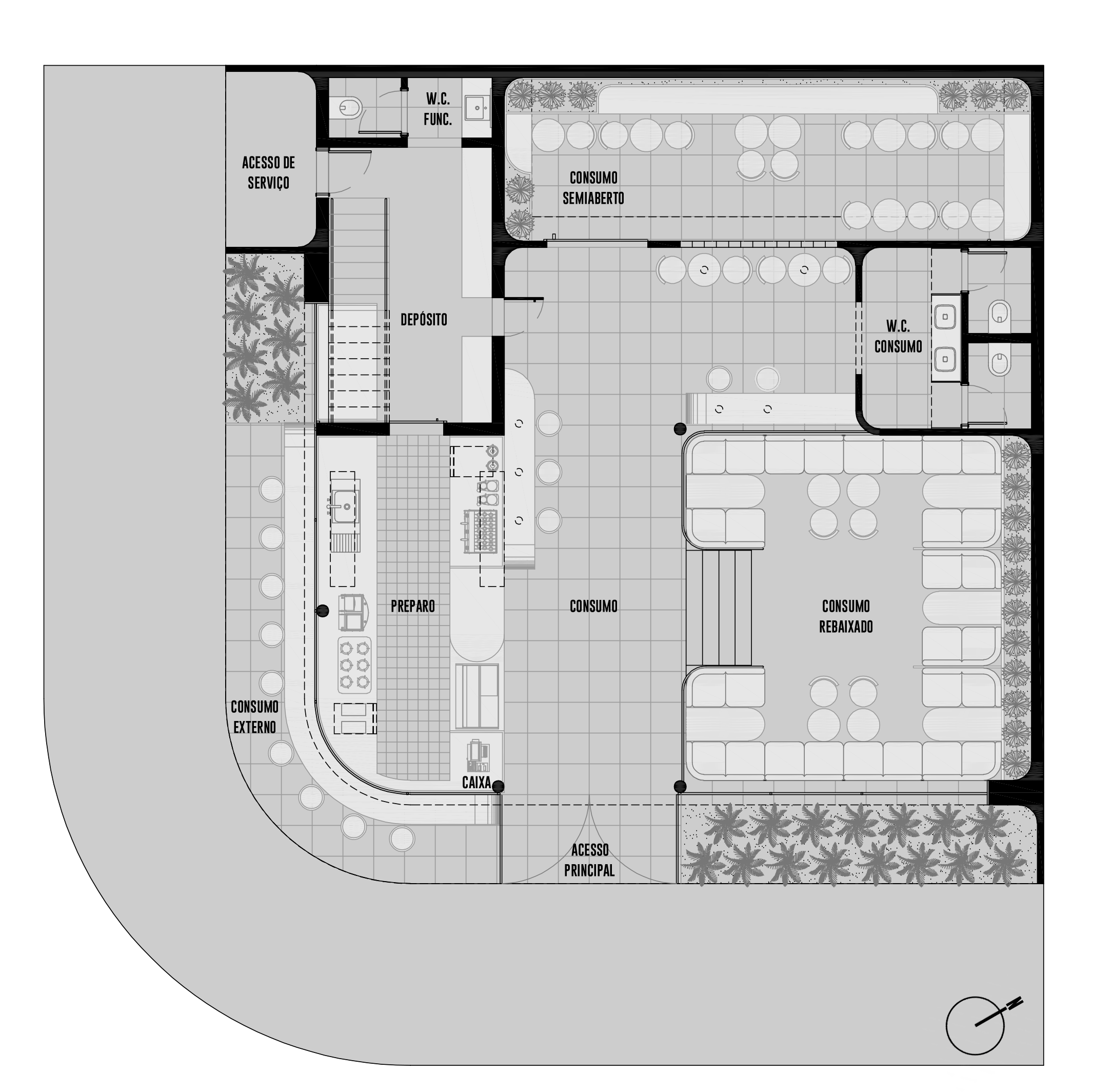 As circulações internas foram cuidadosamente planejadas para o funcionamento dinâmico do café, permitindo que a rotina de atendimento e preparo se desenvolva com fluidez. A área aberta posterior, solicitada pelo cliente, garante ventilação cruzada entre a rua e o fundo do lote, complementada pela iluminação natural controlada pelas fachadas orientadas a pontos estratégicos de insolação.