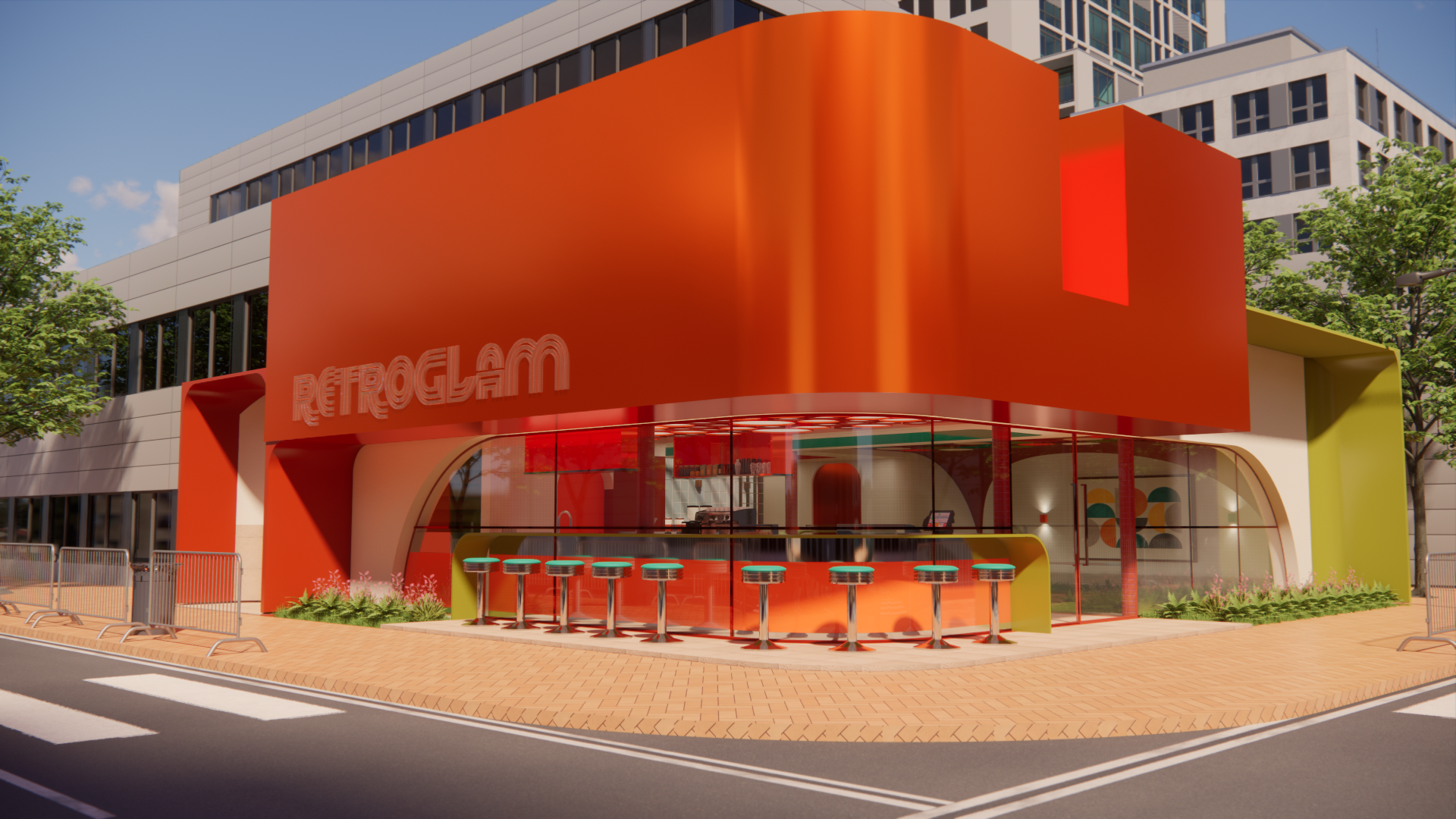 Voltado para uma esquina movimentada, o Café Retroglam transforma sua fachada em vitrine urbana. O uso generoso do vidro permite que o interior se revele ao público, despertando a curiosidade de quem passa e convidando à entrada. O desenho das fachadas e a aplicação de cores vibrantes destacam o edifício no entorno, reforçando sua presença como ponto de referência local.