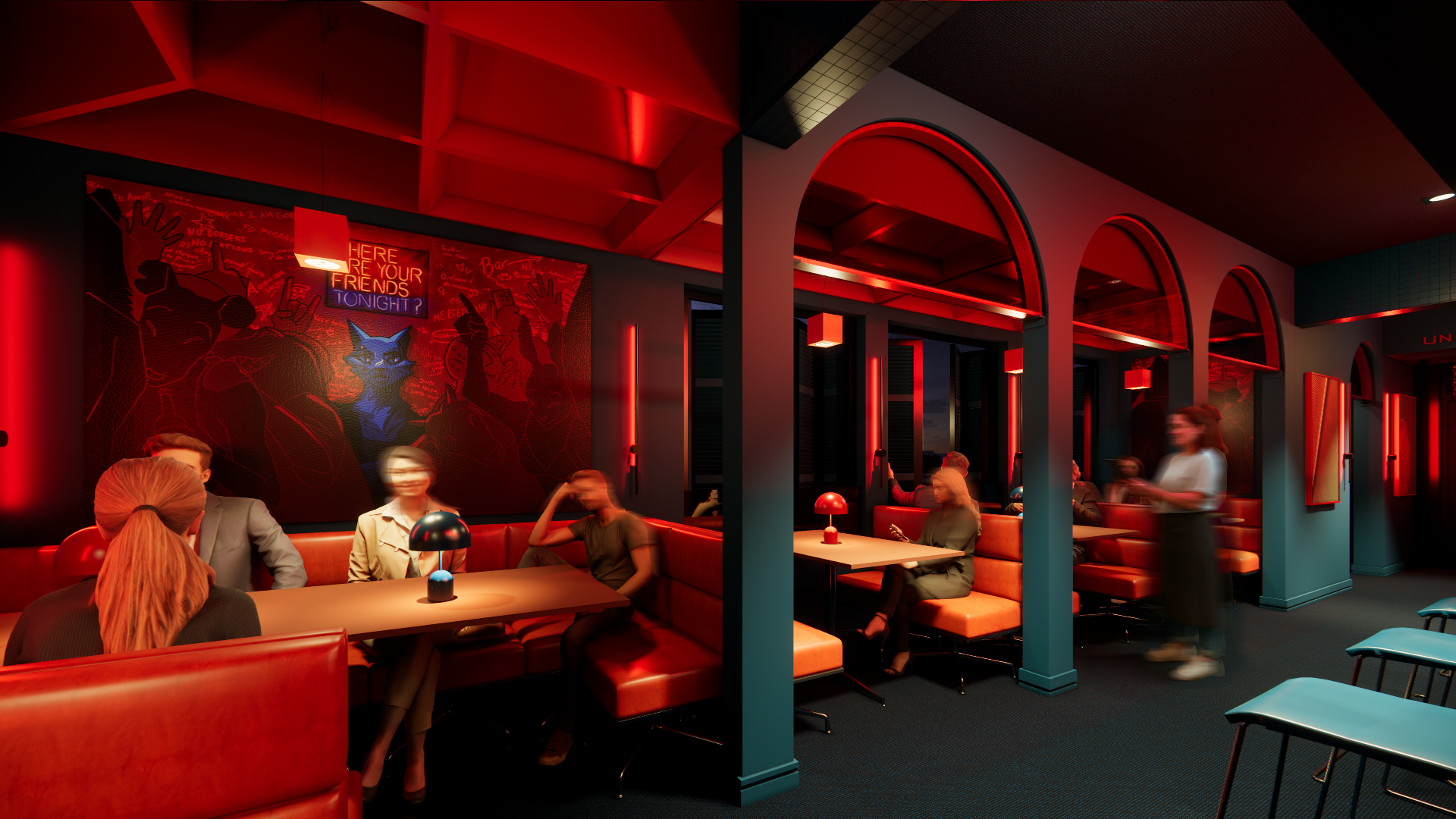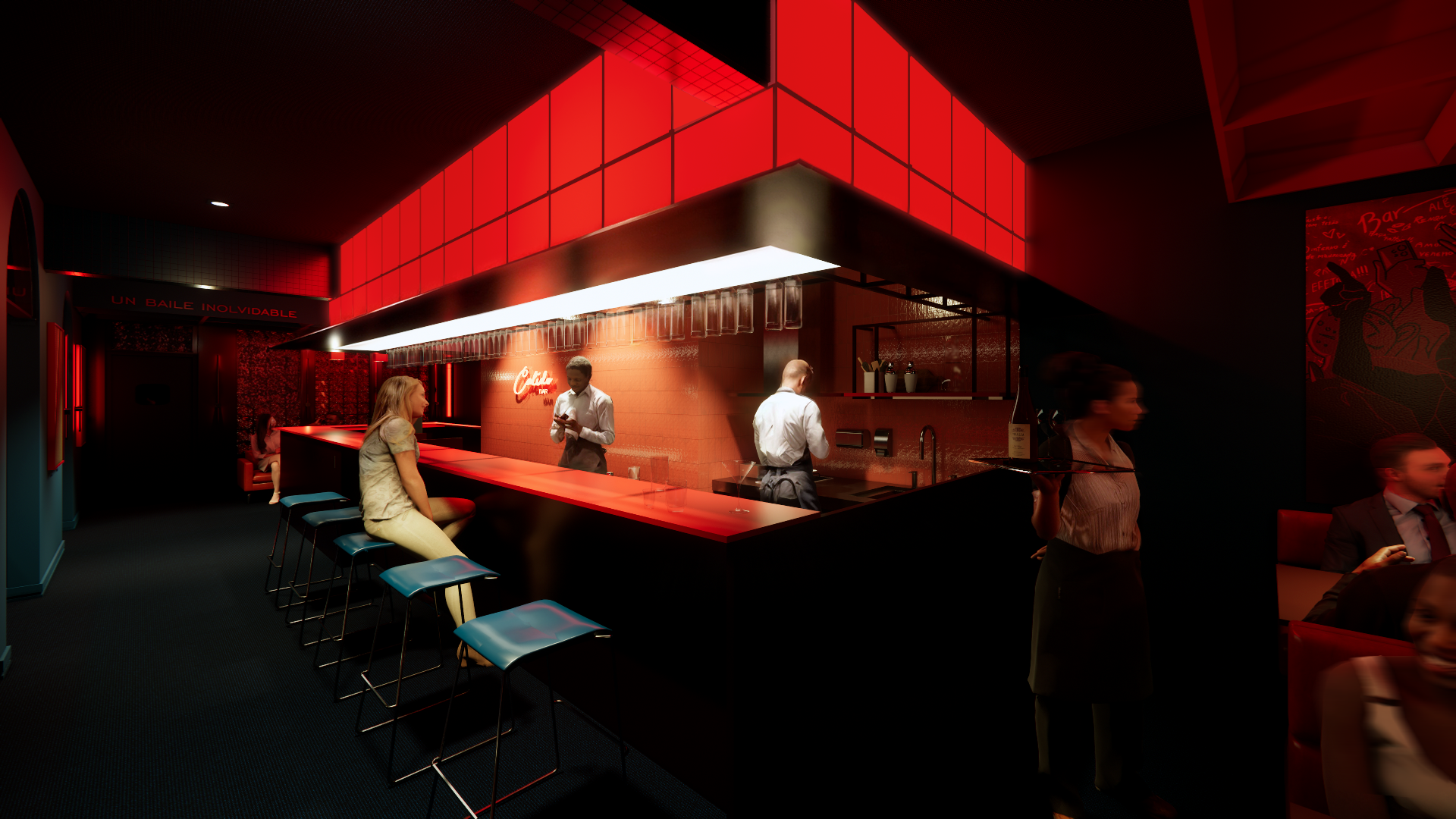 Encomendando ambientes vibrantes que, ao mesmo tempo, proporcionassem intimidade e aconchego aos frequentadores, o cliente manifestou grande interesse por iluminação cênica e acabamentos contrastantes em tons de vermelho e azul, com a intenção de evocar perspectivas quentes e frias em constante interação.