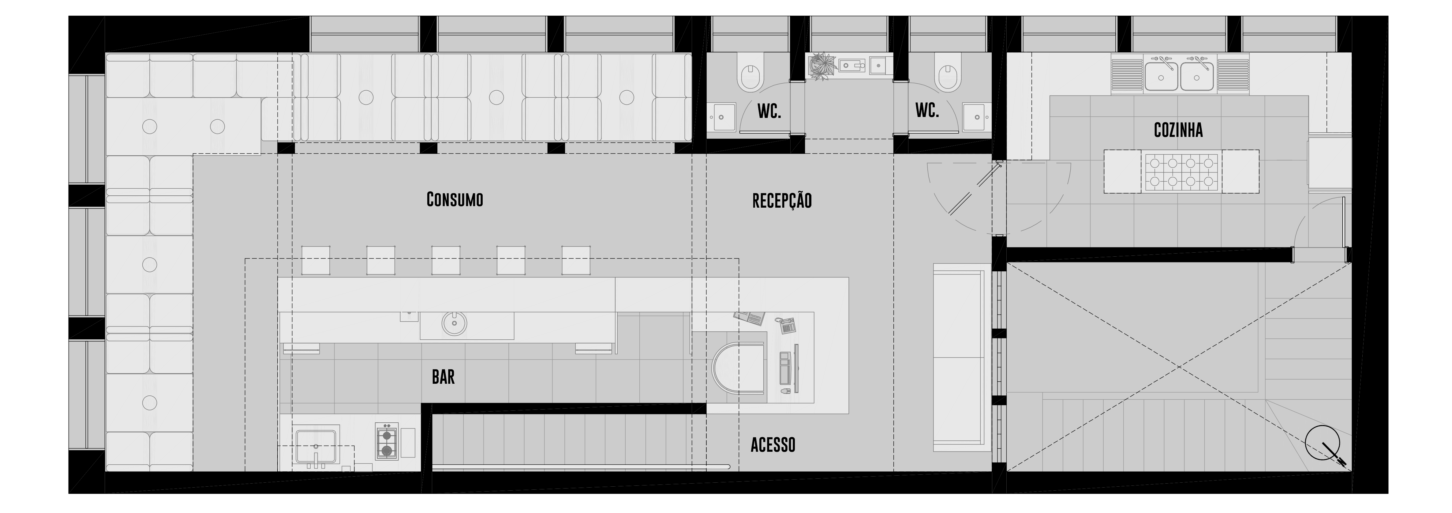 Por se tratar de um bar com cozinha, os ambientes de consumo foram organizados de modo a acomodar tanto grupos de frequentadores quanto visitantes individuais. Dessa premissa nasceu o coração do projeto: as estações de consumo e o bar solitário.